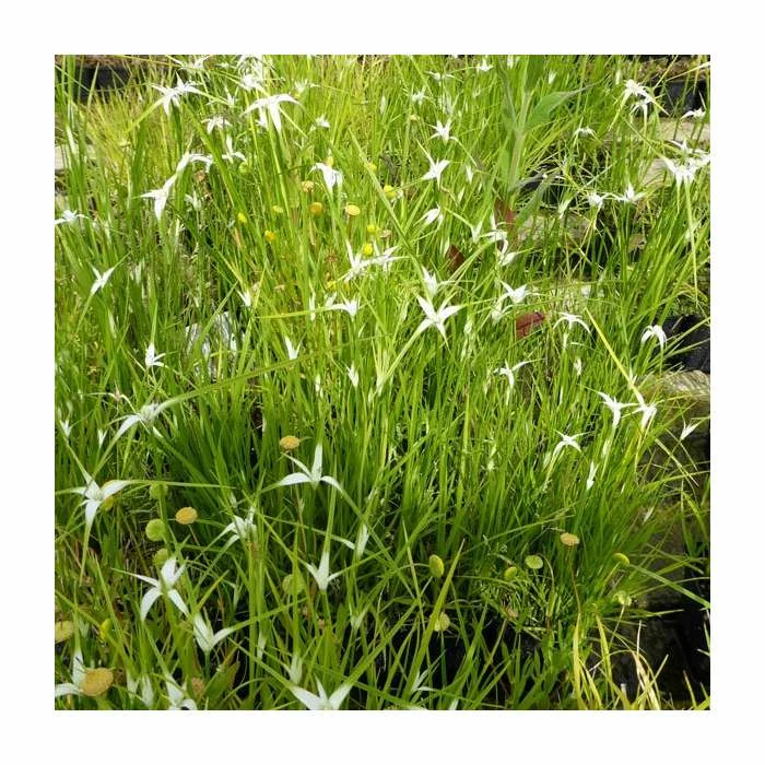 ‘White Star Grass’ is a tender, aquatic Sedge. It produces tufts of bright green stems, which are topped with white, star-shaped flower bracts