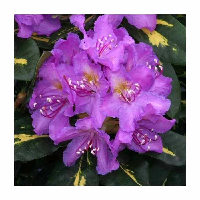 Lilac purple flowers in late May. Compact evergreen shrub. Golden variegated foliage.